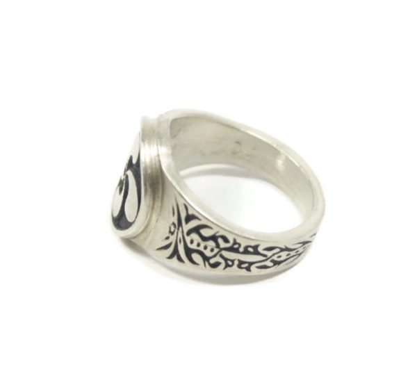 The beautiful pewter ring is a silver color and the background is blackened to bring out the fine detail of the design.